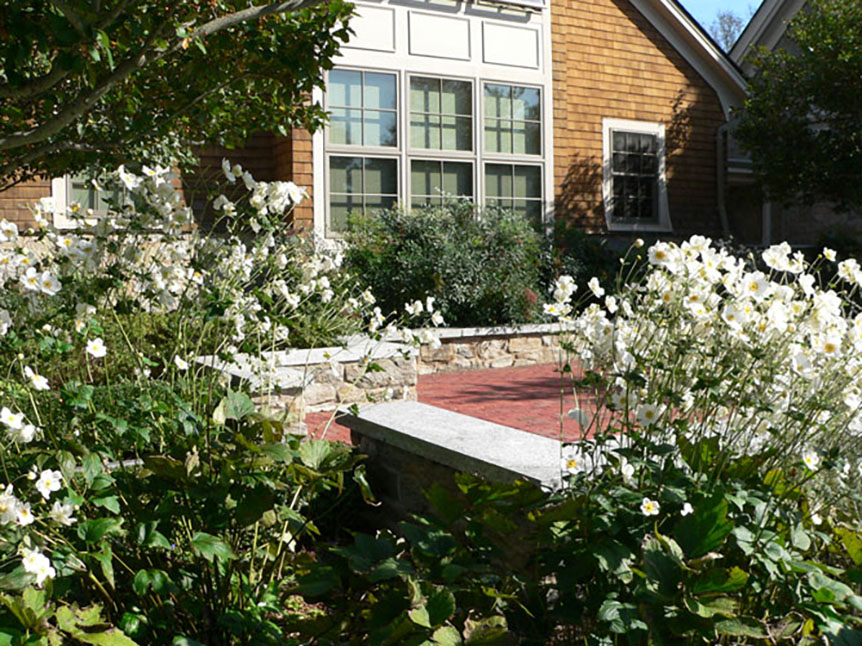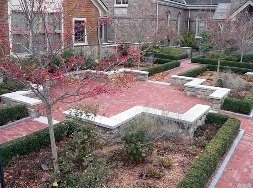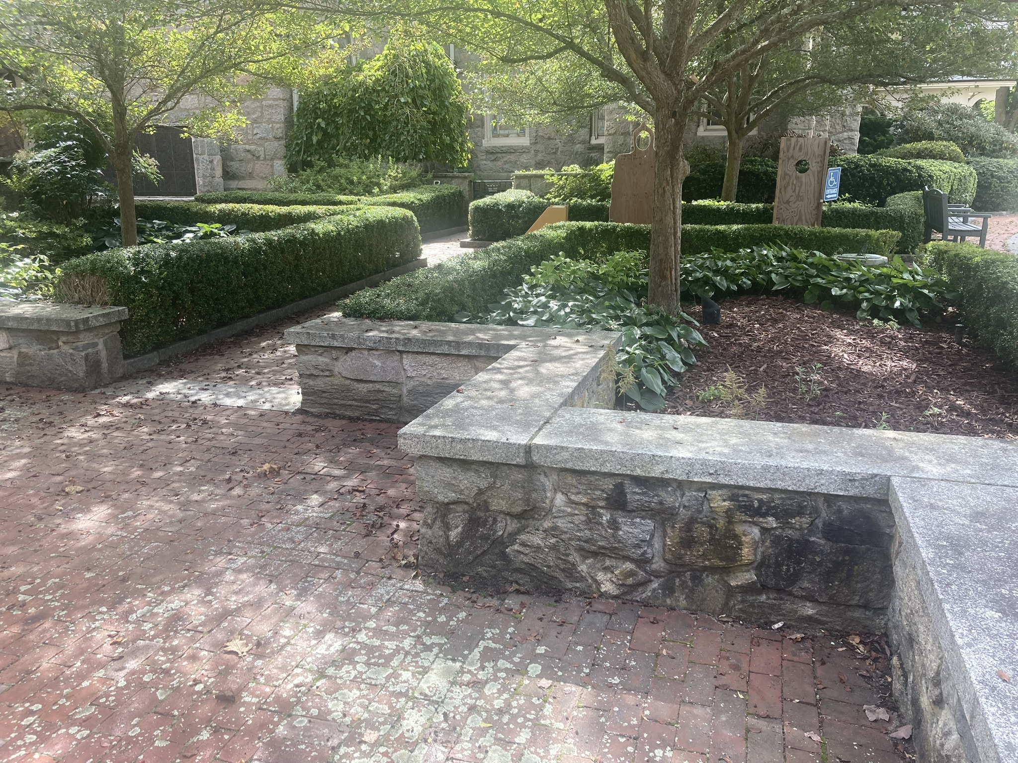 Peace Dale Congregational Church, a beautiful historic stone structure completed in 1872, added an annex in 2007. We designed and built this courtyard to tie the old and new together and welcome visitors to both the church and annex. A space for quiet contemplation as well as a gathering place for outdoor services, the design was inspired by cloister gardens found in many old churches and monasteries.
