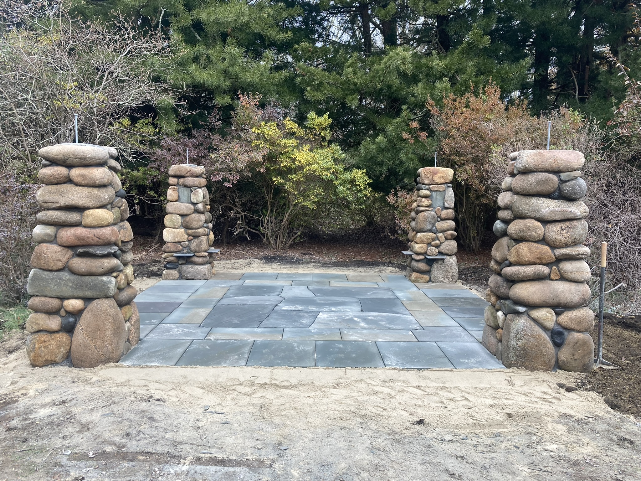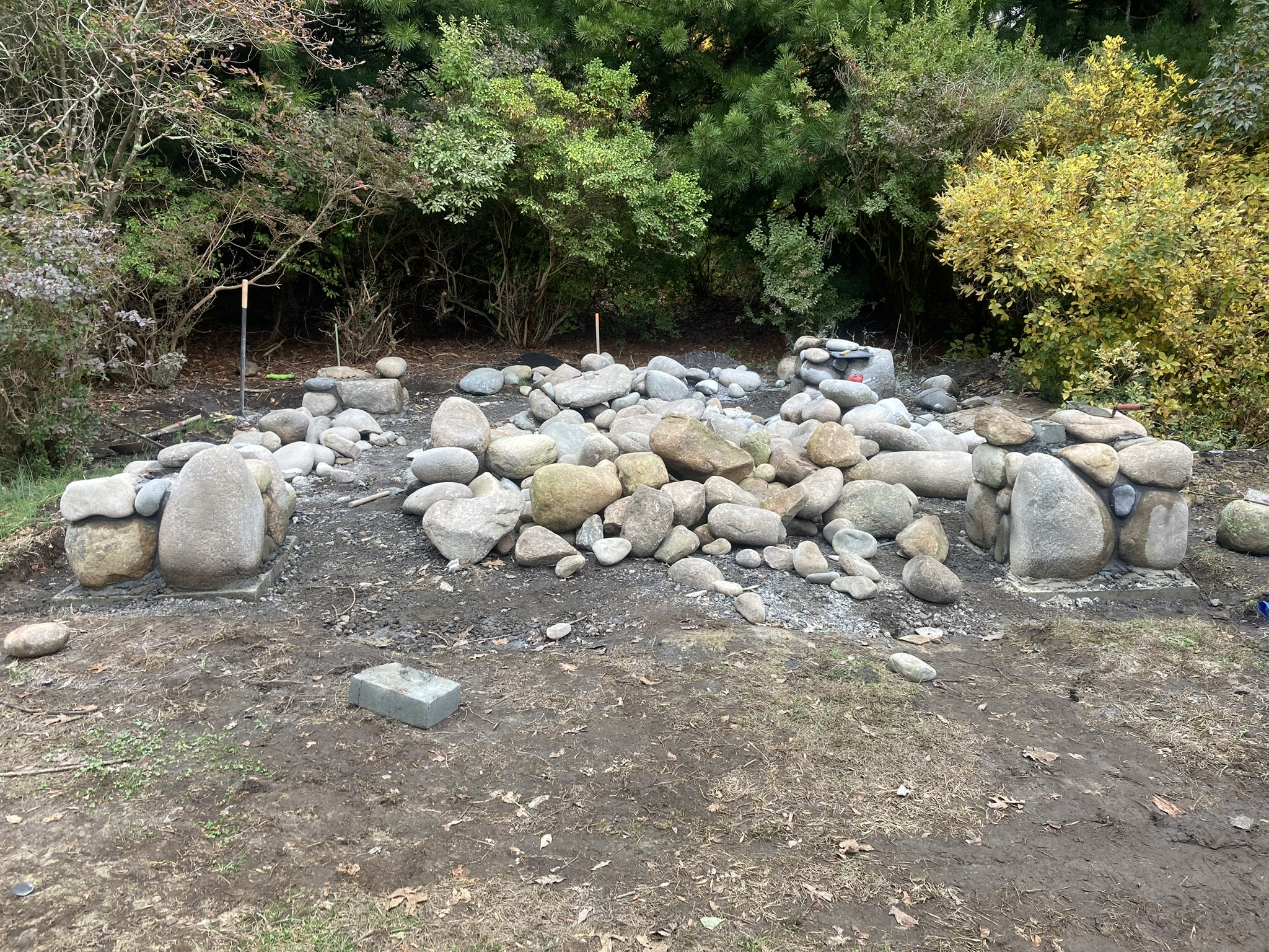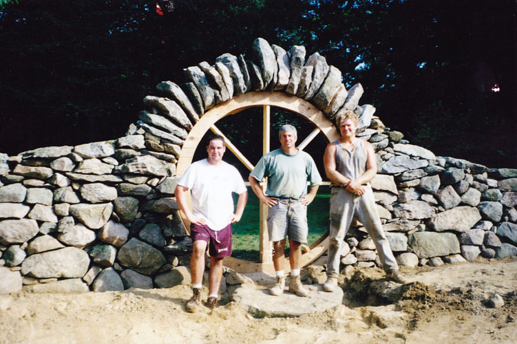 On rare occasions a project comes around where the site, the design, and the execution all work together in harmony so that the whole becomes greater than the sum of its parts. I didn’t know it at the time, but this was the case with the Moon Gate at Kinney Azalea Gardens. Mr. Kinney’s heirs and residents at the Gardens, Tony and Betty (Kinney) Faella, wanted a moon gate for Tony’s 75th birthday. The location was spectacular, a narrow view corridor from the house, through a path lined with azaleas, terminating at a fieldstone wall. The exact siting of the moon gate and the size of the opening (8′ diameter), were all part of Tony’s vision. All we had to do was put it together.